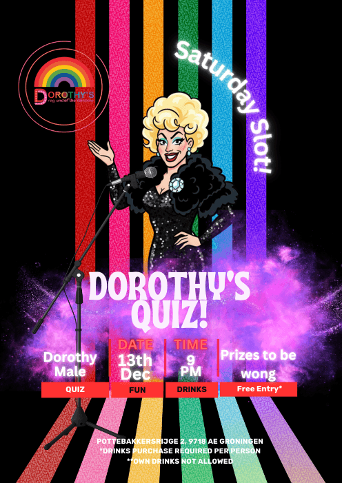 We have a fantastic group of ‘house drag queens’ led by the ‘Mother of the House’, Dorothy Male. All are feisty, fabulous and flamboyant, hosting our evenings and facilitating a great night. We also bring a wide range of guest Queens from across the Netherlands (and sometimes abroad) to mix it up. Sometimes, that even includes drag queens from Ru Paul’s Drag Race Netherlands!